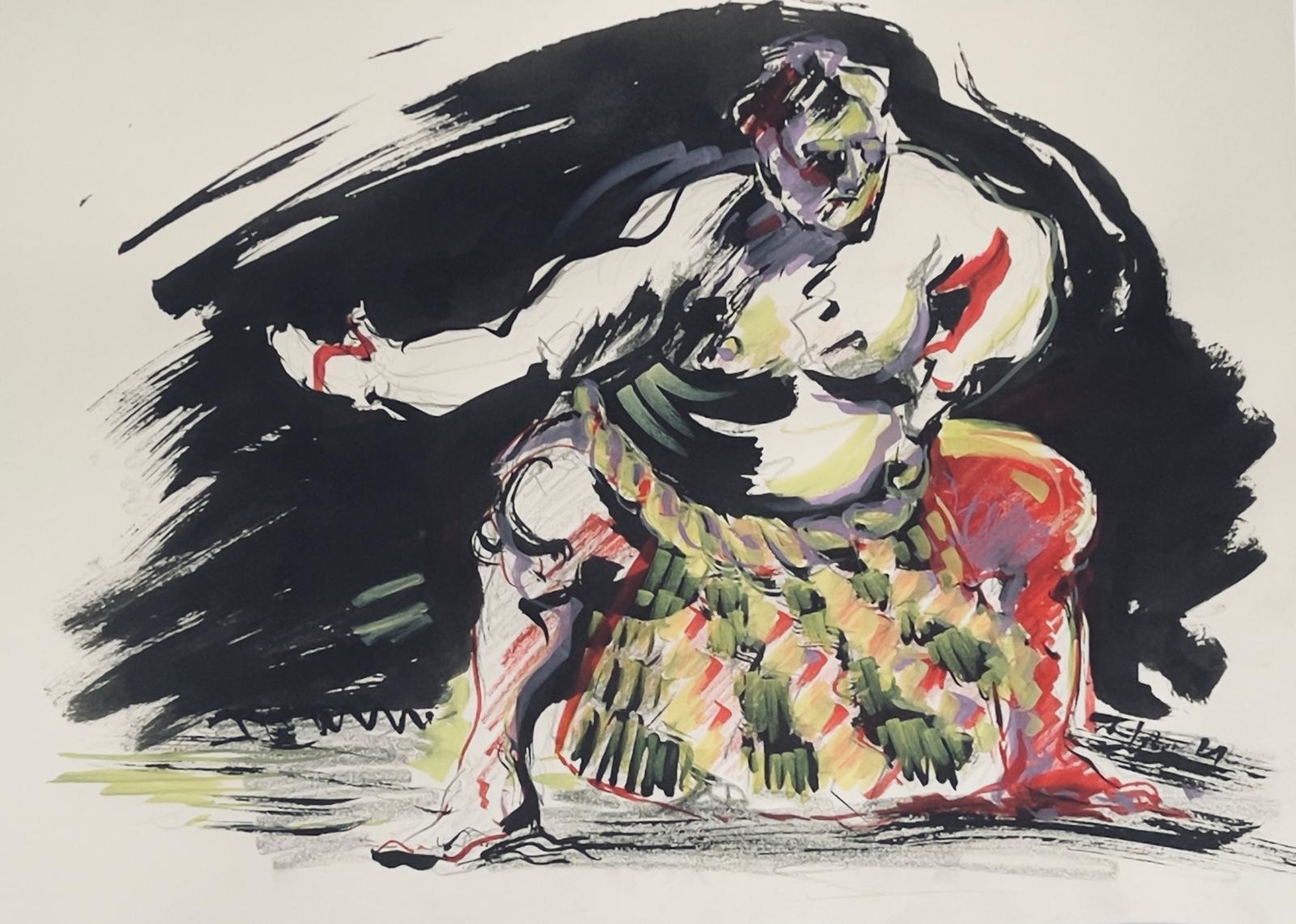 Dessin « Lutteur de sumo Sumotori – Rikishi II – Arts Martiaux » techniques mixtes sur papier 29,7 × 40 cm