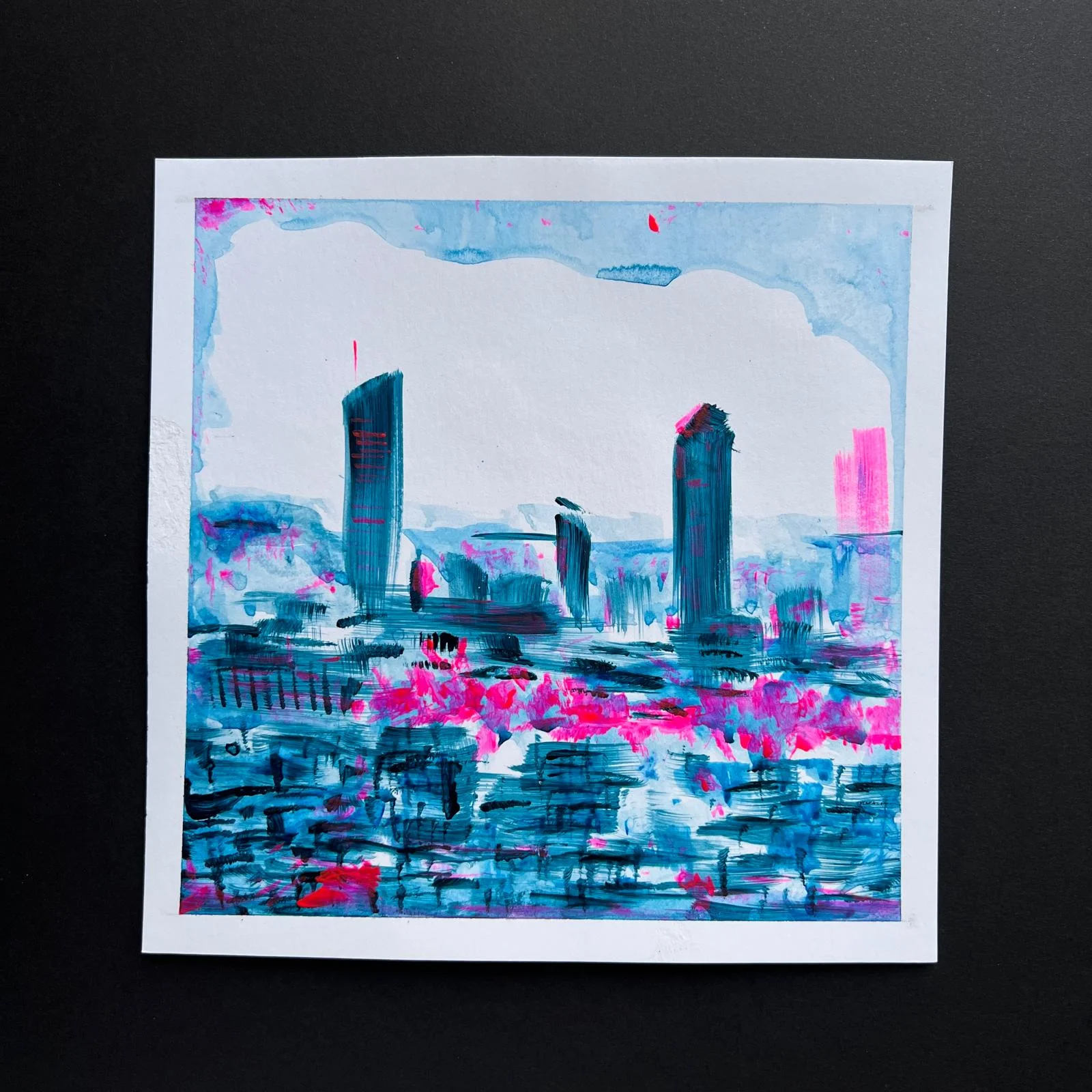 Cette petite peinture contemporaine « Lyon Les Tours » fait partie d’une série – La ville en bleue – J’ai voulu capter l’énergie contemporaine de Lyon à travers ses tours emblématiques. La puissance du bleu de Prusse joue avec la tonique du rose électrique. L’Å“uvre est vendue nue sans passe-partout ni cadre. La présentation sur fond noir est une mise en scène pour la prise de vue. |